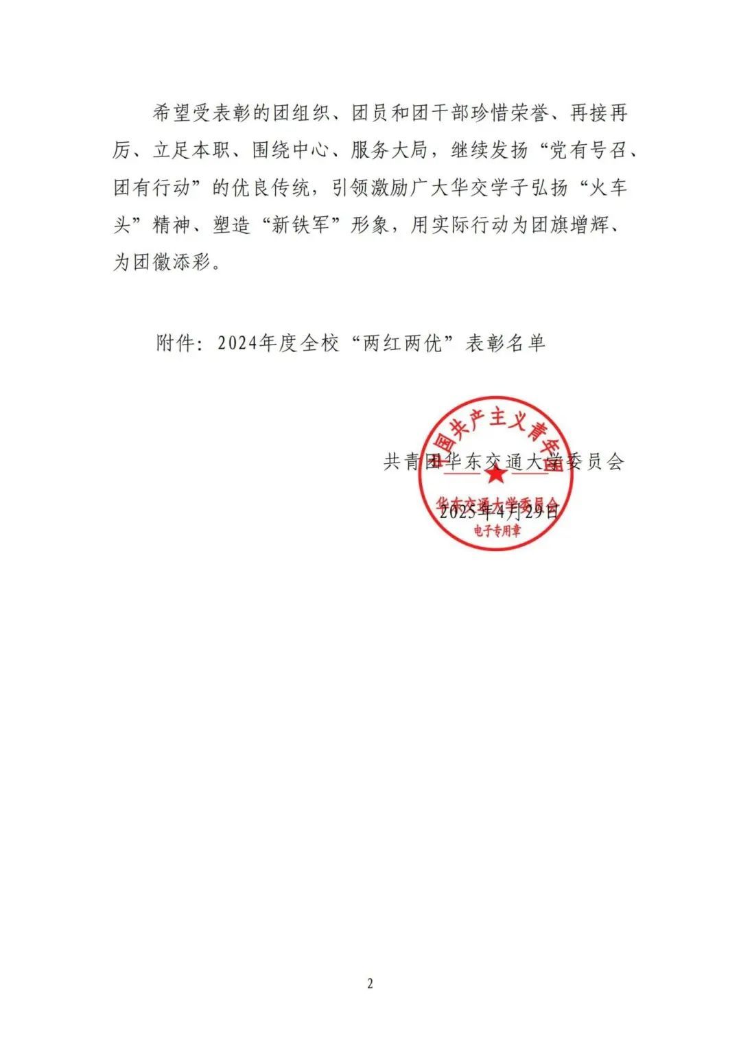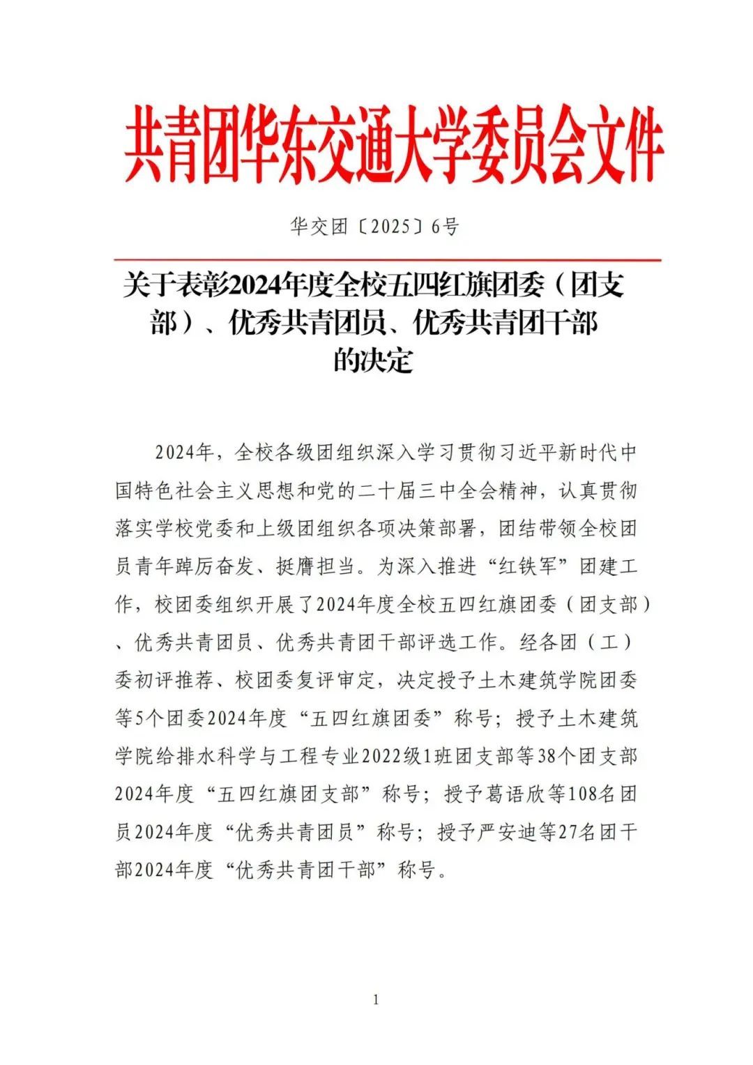 ●严安迪等2人获评2024年度全校“优秀共青团干部”,葛语欣等10人获评”优秀共青团员”。