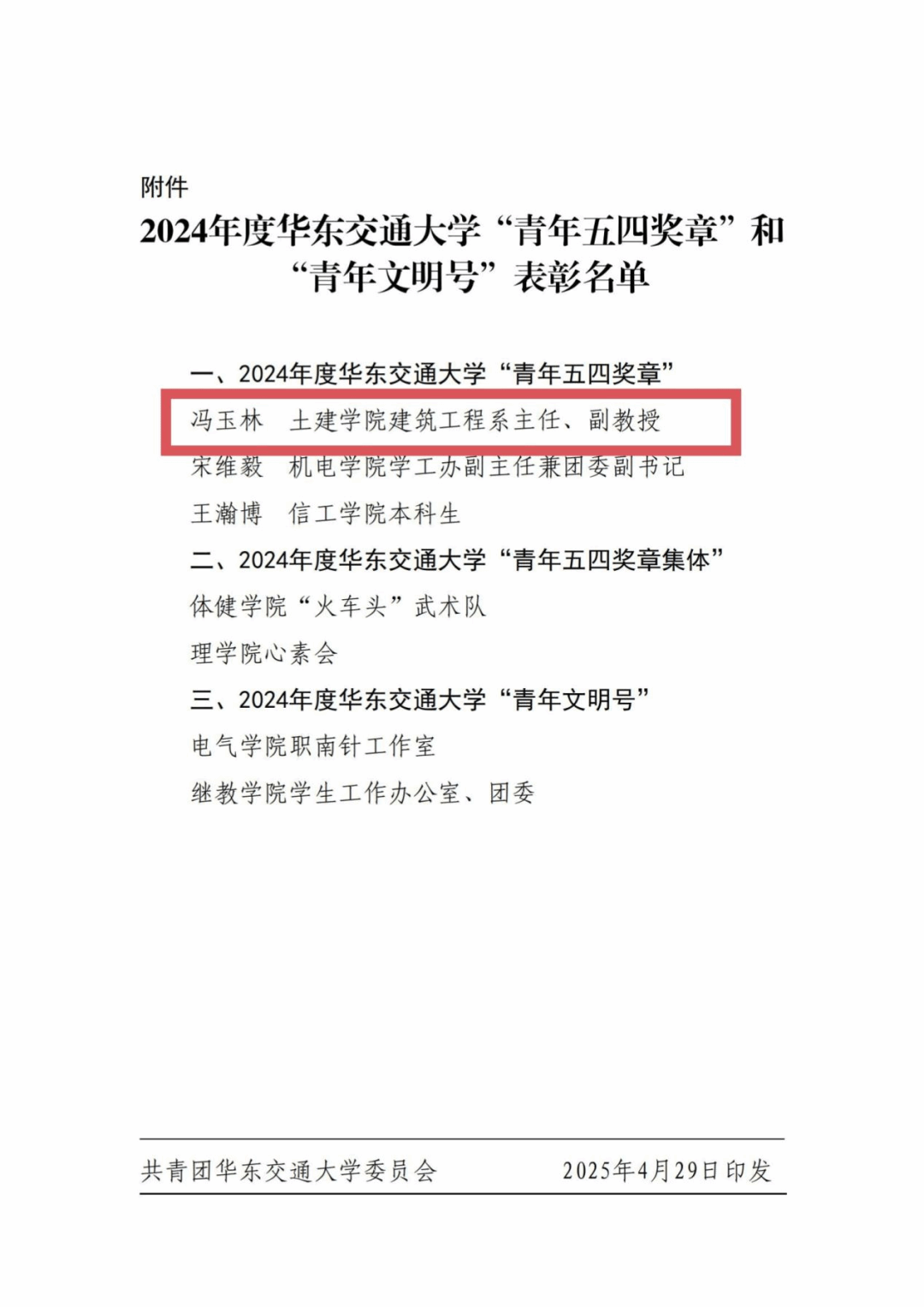 ●冯玉林老师荣获2024年度PA视讯“青年五四奖章”。
