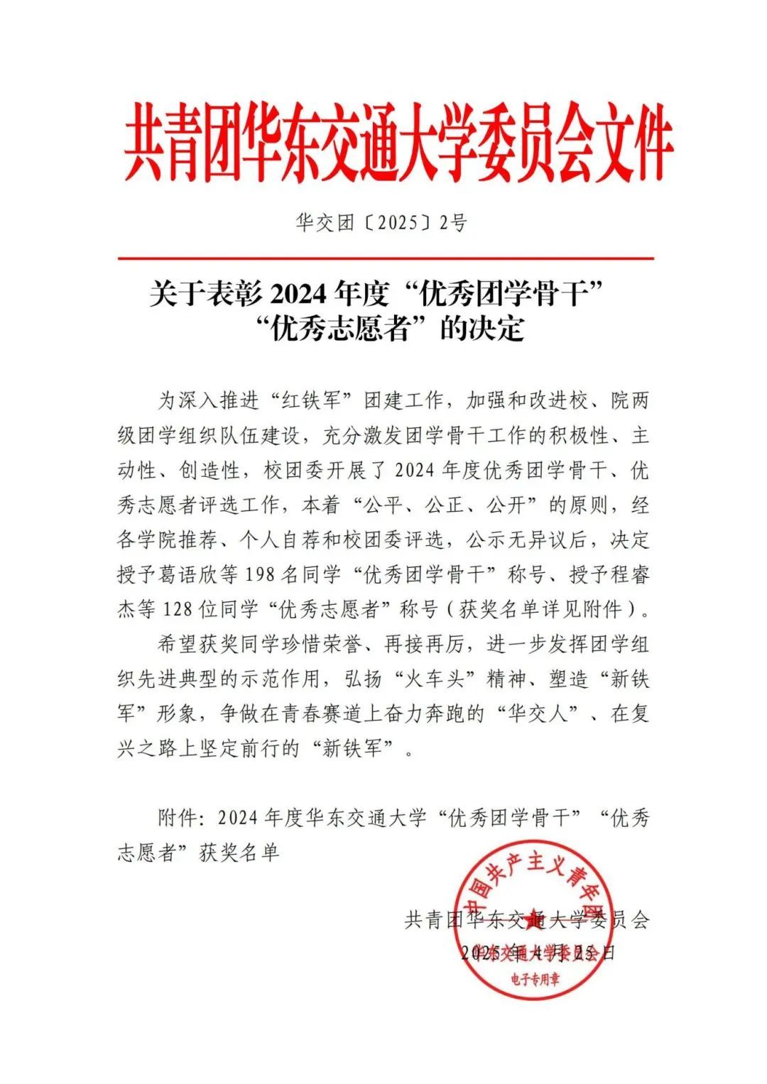 ●葛语欣等16人获评2024年度“优秀团学骨干”,程睿杰等7人获评2024年度“优秀志愿者”。