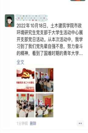 2022年10月18日,市政环境研究生党支部在三化平台开展主题为“以青春风采,启航新时代”的党日活动,活动共有五个环节:微生活、微党课、微评论、微观影、微心声。