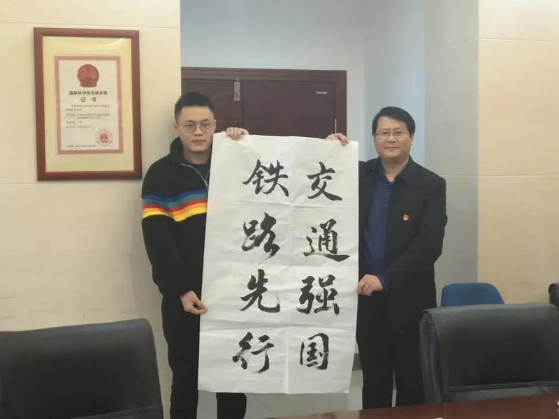 座谈会后,党员江浩宇代表詹天佑班员工党支部党员向张鹏飞老师赠送“交通强国,铁路先行”字画,张鹏飞老师对其大加赞赏。