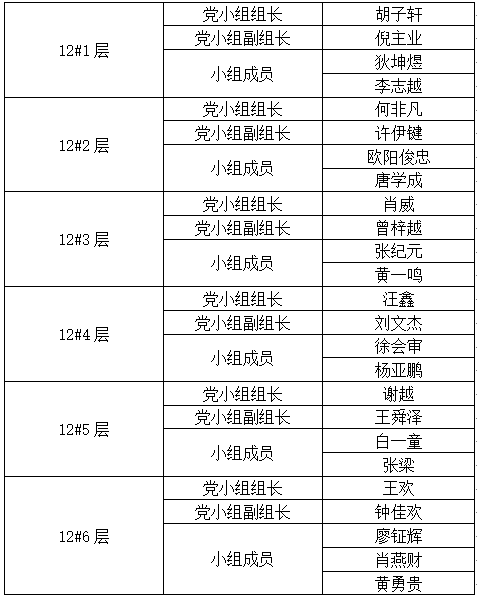 以“创建特色支部,营造温馨公寓,争做模范党员”为主题,建立员工宿舍楼栋党支部、楼层党小组。在2020年11月26日下午,由员工12栋楼栋党支部书记徐会审主持换届工作并宣布换届名单,员工12栋员工党员参加会议。