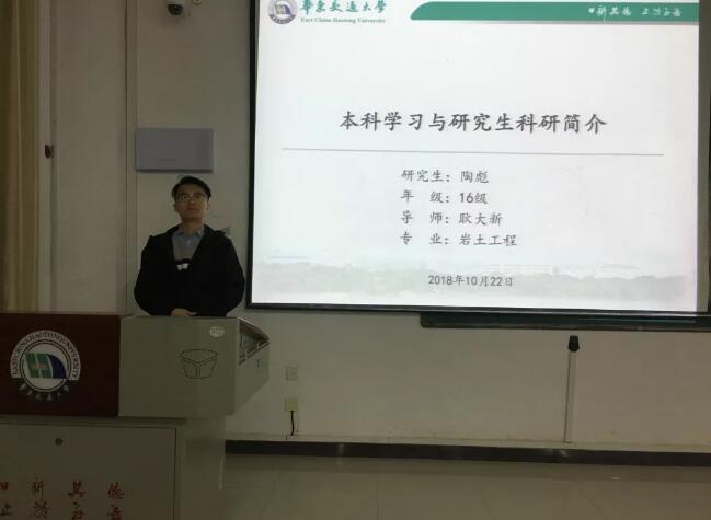今天的主人公就是来自建筑与土木工程(岩土)专业的陶彪。陶彪师兄给18级土木工程班的同学分享了本科阶段学习历程以及在公司参加的各种活动,以及从这些活动中学到了些什么,为自己以后的学习生活积累了宝贵的经验。另外告诉学弟学妹有哪些校级荣誉可以去努力争取,比如:国家奖学金、国家励志奖学金等等。荣誉不仅是一种奖励更是自己努力的一个见证。对于考研陶彪师兄有独特的方法和见解,他分享了自己的考研之路,以及在考研过程如何复习各学科的方法。这给学弟学妹一个很好的借鉴方法。在研究生阶段,对于论文的写法,要找到自己的思路与研究方法,并重点介绍了专利的写作方法。