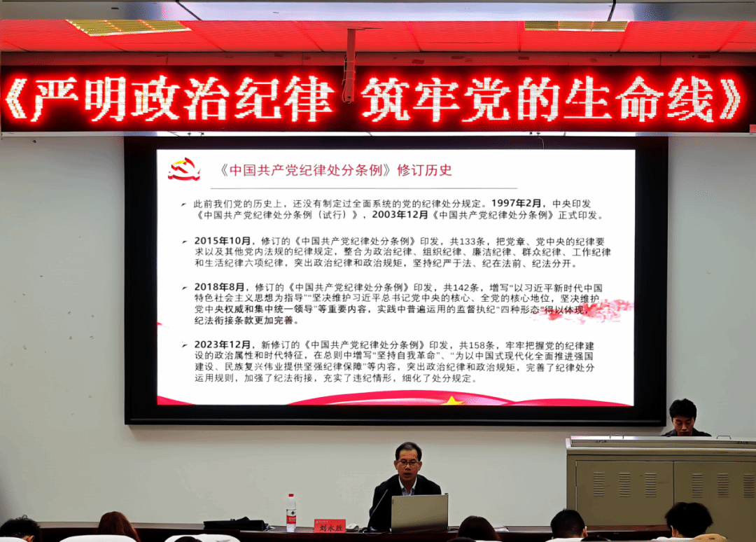 刘永胜从习近平总书记在中国共产党第二十届中央纪律检察委员会上的讲话切入,联系《中国共产党纪律处分条例》修订历史,介绍党纪学习教育的重要性。他强调,要深刻领会“两个确立”的决定性意义,把“两个确立”转化为坚决做到“两个维护”的自觉行动,增强做到“两个维护”的政治定力和政治能力。严明政治纪律,必须坚持“五个必须”,并且坚决防止“七个有之”。