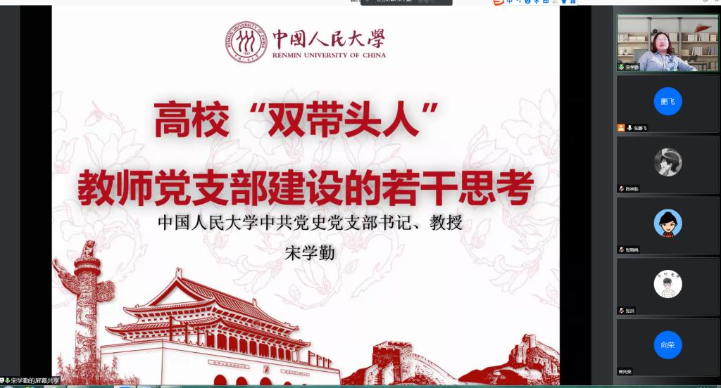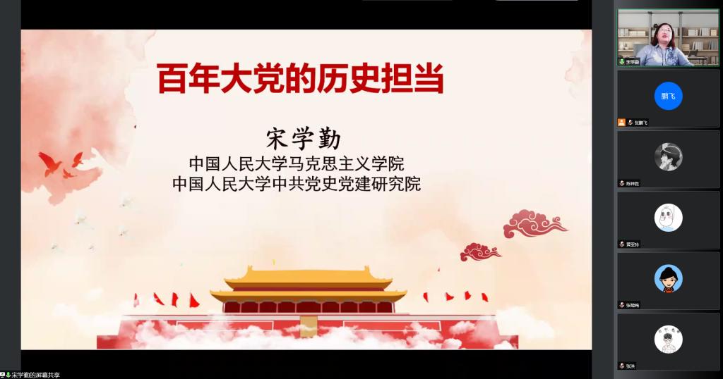 8月24日,我支部邀请中国人民大学马克思主义公司宋学勤教授给教师员工党员做了题为《百年大党的历史担当》的报告。报告会采用腾讯会议线上进行。