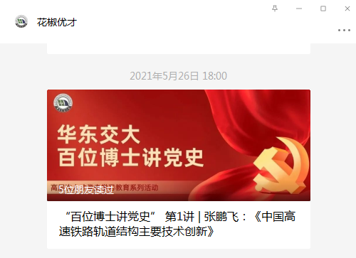 公司举行“百位博士讲党史”活动,陆续在“花椒优才”微信公众号推出了张鹏飞、黄大维两位老师的课程展播。