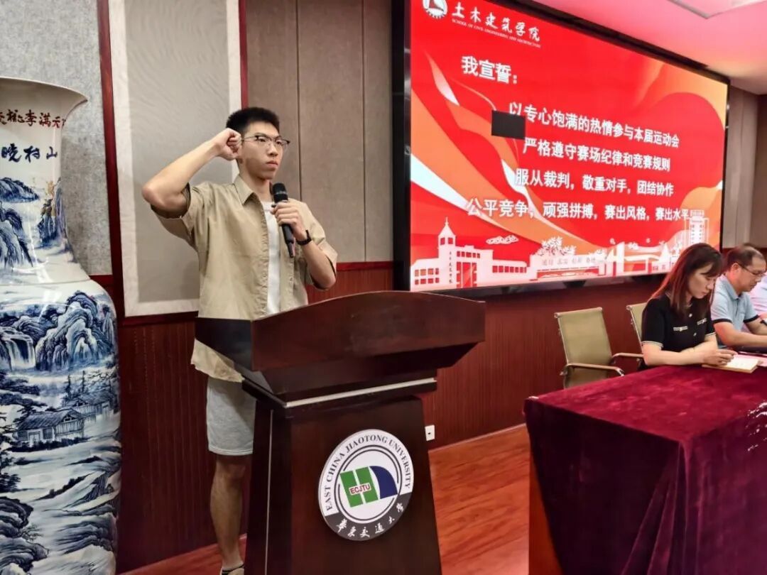 在优秀运动员代表江庭晖的带领下,全体队员庄严宣誓,承诺将以积极拼搏的姿态投入比赛,恪守赛纪、团结协作、勇创佳绩,为公司荣誉而战。