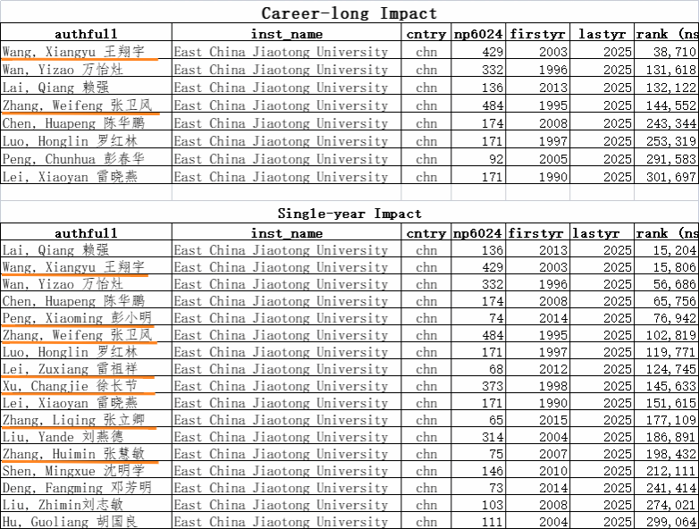 据了解,全球前2%顶尖科学家榜单分为“终身科学影响力排行榜”和“年度科学影响力排行榜”两大部分,从全球近700万名科学家中,通过基于其论文引用数、h因子、合著者修正的hm因子、单独或第一作者的文章引用数等综合参数,遴选出世界排名前2%的科学家,涵盖22个领域和174个子领域。其中,“终身影响力”榜单统计科学家职业生涯期间的综合表现,“年度影响力”榜单则聚焦上一年度的学术影响力。