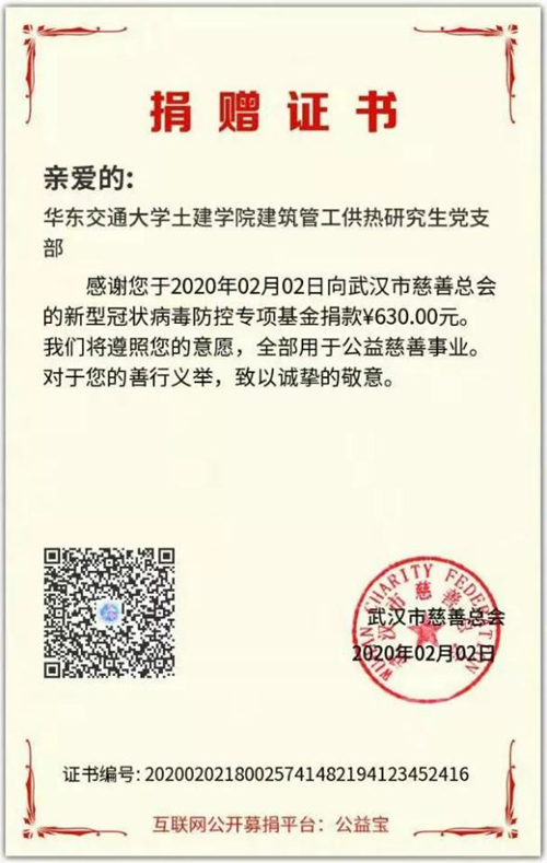 此外,同学们得知武汉疫情严重的消息后,纷纷伸出援助之手,以个人、班级、党支部的名义自发进行线上线下捐款,陆续通过武汉市慈善总会、北京韩红爱心慈善基金会、中华慈善会等渠道向湖北地区捐款共8459.92元,汇聚抗击疫情的爱心与力量。