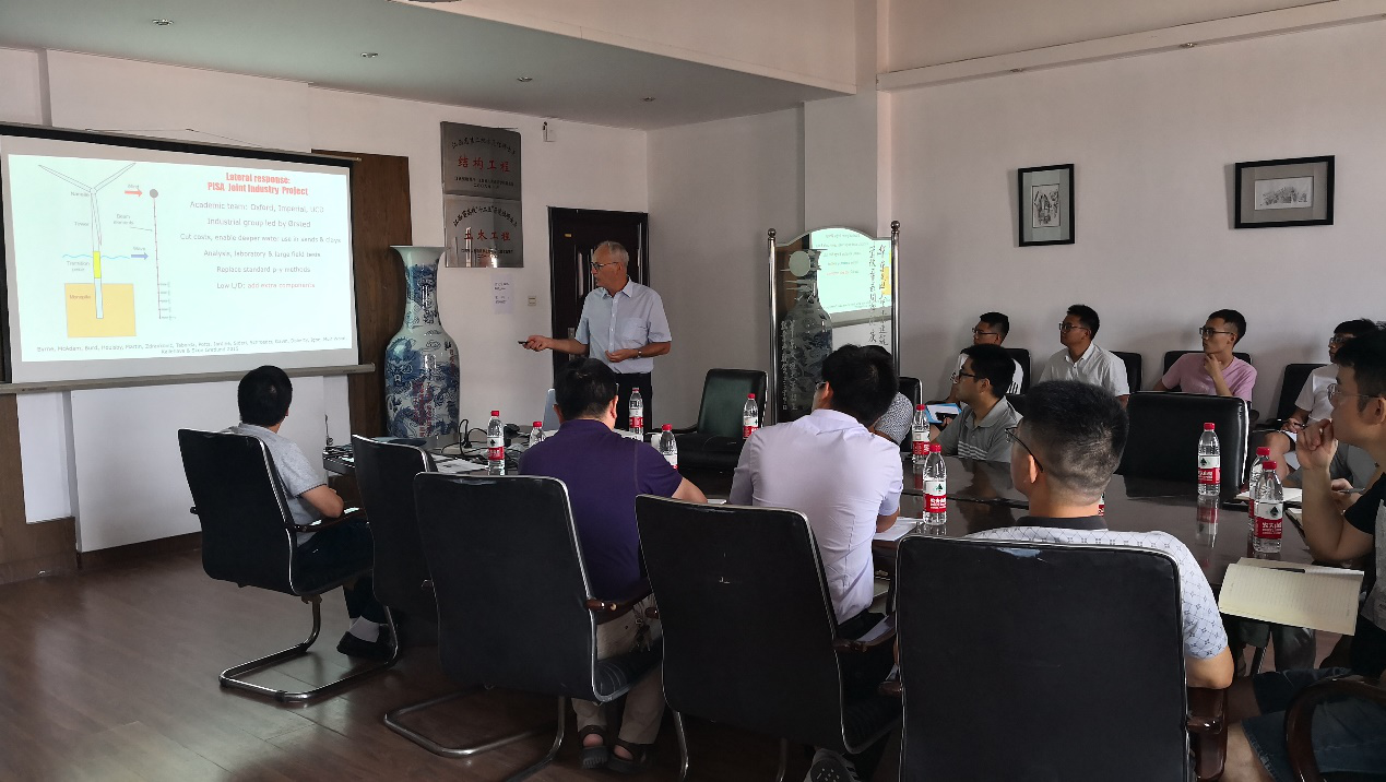 Jardine教授作了题为“The Behaviour of Piles Driven in Weak Calcareous Chalk, with Particular Reference to Offshore Wind-turbine Foundations”的精彩学术报告。报告回顾了砂土、粘土中打入桩的特性和承载力分析方法以及软弱钙质石灰岩中海上风电打入桩基的承载力关键问题,根据2个海上风电和陆地软弱钙质石灰岩打入桩基的大型原位试验和测试分析,结合PISA项目研究成果,提出了软弱钙质石灰岩打入桩的Chalk ICP-18轴向承载力计算方法、水平荷载和循环荷载特性,并介绍了目前正在进行的重大工程ALPACA项目及其国际合作进展情况。Jardine教授的讲座内容丰富、深入浅出,并与参加讲座的老师和员工进行了深入的讨论和交流。