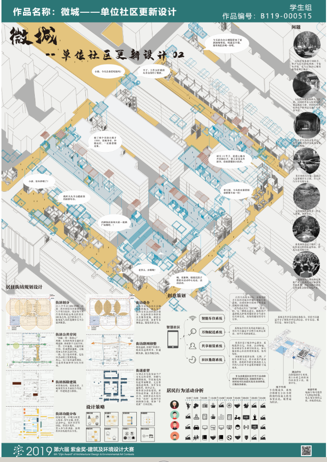 参赛作品《微城-单位社区更新设计》以“微城”为设计核心,更新改造一个单位大院内的单位社区,致力于打造一个活力共生、幸福宜居的单位社区。设计的目的是将单位社区打造为微型城市单元,小而全的社区。目前单位社区面临两方面的更新难题,一是单位大院的“孤岛”现象,二是单位社区老旧,缺乏大量公共服务空间。本设计通过打通断头路,建立小型居住街坊围合空间,创造一个大开放小封闭的单位社区。同时利用“智能社区”系统,使单位社区形成社区、城市共享网络。实时更新的资源信息使的紧张的城市空间资源在时间维度上加大利用效率。在单位社区之中,置入青年公寓,小型商业等功能,打破单元社区的大范围的人口均质化现象,增加城市核心地段社会经济价值。