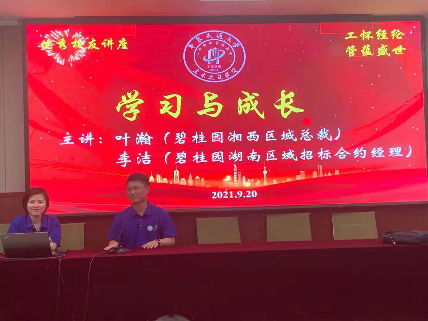 值母校50周年华诞,2008级工程管理专业优秀员工叶瀚、李洁受邀返校参加校庆庆典之际,2021年9月20日下午,建设管理系邀请叶瀚、李洁在PA视讯集团官方网站学术报告厅为专业学弟学妹们分享了一场《学习与成长》的精彩报告。