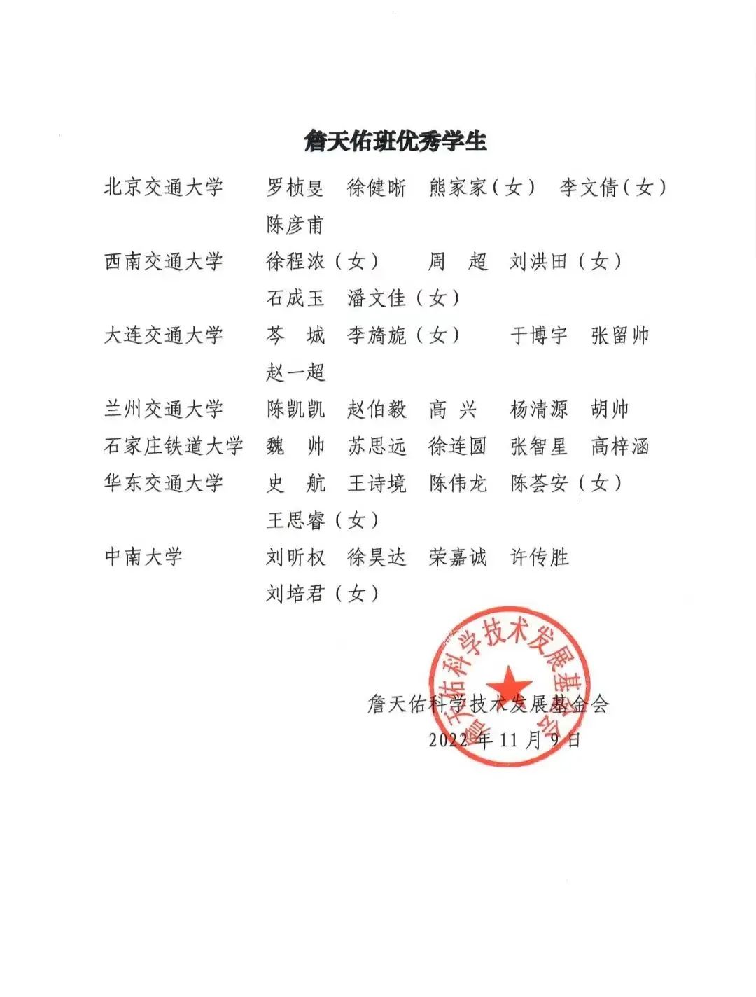 根据詹天佑科学技术发展基金会《詹天佑班管理办法》,经各公司推荐,詹天佑基金会秘书处审定,确定2022年度奖励詹天佑优秀班集体7个、詹天佑奖学金获得者35名。公司2020级土木(城轨詹天佑)班获评2022年度詹天佑班优秀班集体,史航、王诗境、陈伟龙三名同学获评2022年度詹天佑班优秀员工。