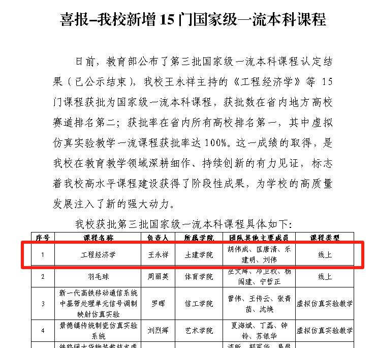 近日,教育部公布了第三批国家级一流本科课程认定结果(已公示结束),公司王永祥教授主持的《工程经济学》课程凭借丰富的教学内容、创新的教学方式与显著的教学成效,成功获批“国家级一流本科课程(线上)”,这是公司在本科课程建设领域取得的又一重要成果,更是对课程团队多年来教学改革与实践的高度认可。