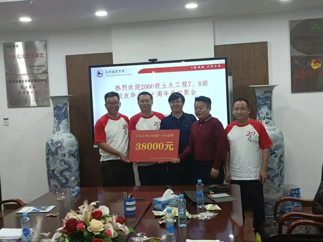 2000级土木7、8班于公司50年校庆之时共捐赠38000元,表达了对公司公司的赤诚之心,公司借2000级土木7、8班本次毕业20年聚会的良机,为此补办了捐赠仪式。