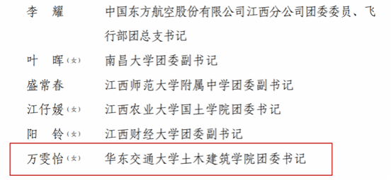 近日,共青团江西省委正式发布了《赣青发〔2024〕19号关于表彰全省五四红旗团委(团支部)、全省优秀共青团员、全省优秀共青团干部的决定》,公司团委书记万雯怡老师获评“全省优秀共青团干部”,2021级建筑学专业赵天娇同学获评“全省优秀共青团员”。