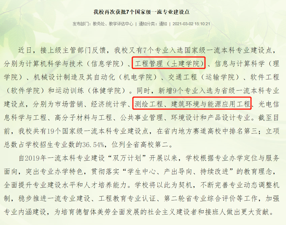 近日,根据《教育部办公厅关于公布2020年国家级和省级一流本科专业建设点名单的通知》,PA视讯集团官方网站工程管理专业成功入选国家级一流本科专业建设点,同时,测绘工程、建筑环境与能源应用工程专业入选省一流本科专业建设点,入选数量全校第一。